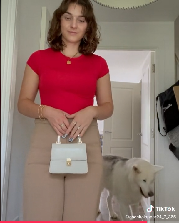 The short clip shows Lucy posing for the camera trying to see if her outfit is cute when her furry friend walks in behind her. When she turns to face the dog, the animal suddenly asks, “Where are you going?”