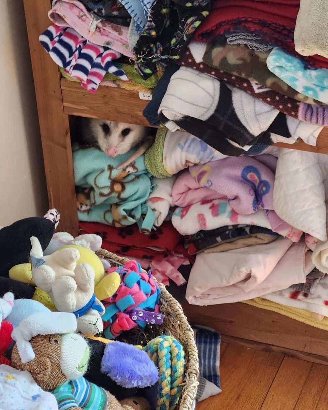 Despite being an animal expert for several years, Brouillard was shocked by a little female Opossum named Yeti, who climbed into a basket of toys and camouflaged herself among the stuffed animals.
