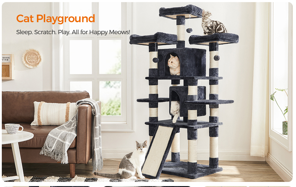 This super large cat tree is designed to satisfy your Savannah or Bengal cat's needs to scratch, play, climb, sleep, and exercise. If your cute cats love climbing up and down together, then this cat tree is for them to have endless climbing fun. The tree's unique rectangle super large condo and wide hammock are perfect for Savannah and Bengal cats to rest together.