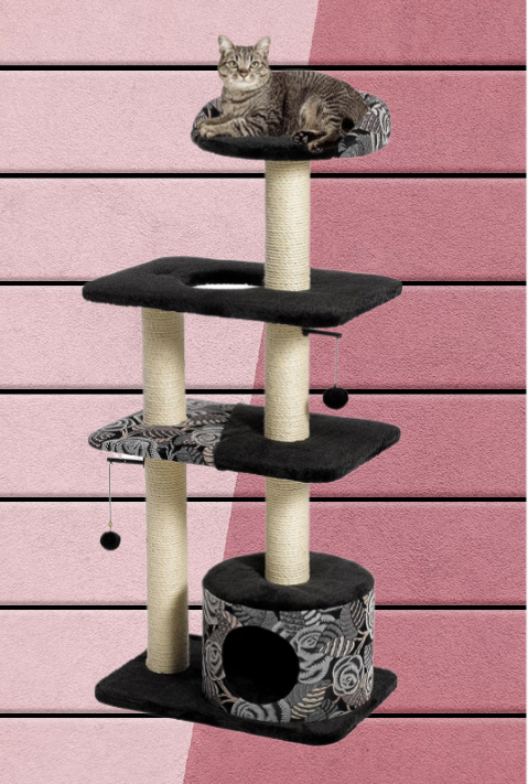 This cat tree features ultra-soft black faux fur with a coordinating designer print fabric, making it the ideal addition to enhance any home decor. Designed to cater to cats' instinctual need to climb high, the high-rise bolstered bed provides the perfect spot for them to lounge and relax. Additionally, the perch seating includes a dangling toy ball, ensuring hours of playtime fun for your feline companion.