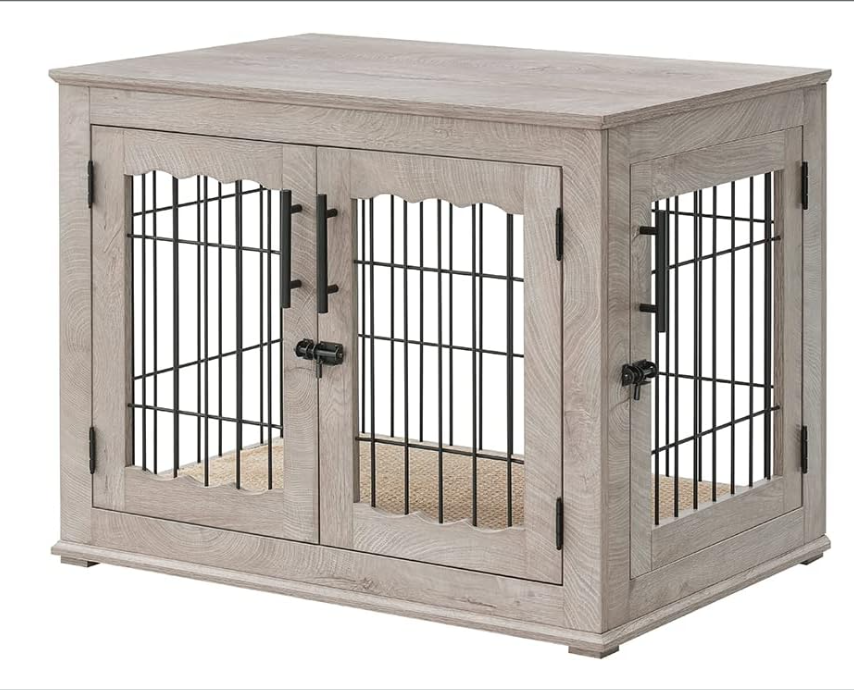This crate's dimensions are 32" L x 23" W x 26" H and it is recommended for trained small to medium-sized dogs. Designed with high-quality metal wire enclosure bars, this wooden crate is well-ventilated for maximum comfort. However, the wood is not chew-proof, which makes the crate unsuitable for aggressive chewers. The crate, which doubles as an elegant side table, comes with a soft, removable dog bed. Pet owners in the U.S. like this crate for its style, sturdiness, value for money, and because it is easy to assemble.