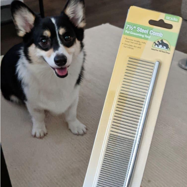 The final best brush for corgis I recommend is a metal dog grooming comb. Combs have many important uses, including removing tangles, mats, and knots from your dog's fur. They are designed to gently glide through the coat, preventing discomfort or pulling. What's more, combing allows you to inspect your dog's skin more closely. A metal comb can be used to finish off the process following a thorough brushing with a slicker brush. You’ll want to ensure the comb can easily pass through all of your dog's hair without any knots or tangles. The Andis 65730 Stainless-Steel Comb is a popular choice among dog owners. Built to last through multiple grooming sessions, this metal comb easily removes knots, mats, and loose hair, leaving your dog's coat soft, sleek, and shining.