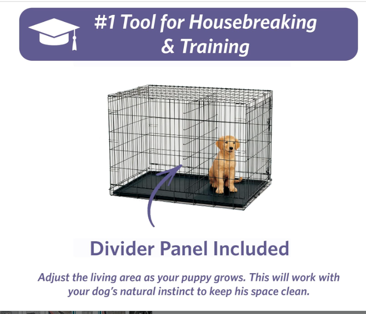 Like the above crate, this metal dog crate comes in various sizes and has a divider panel. However, unlike the above dog crate, which has a single door, this metal crate features two doors, allowing for versatile placement in your home. This crate also comes with a carrying handle, a leak-proof plastic pan, and protective rubber feet. It is portable and easy to assemble with no tools required. The 35.6L x 21.9 x 24.5 inches size is suitable for dog breeds with an adult weight of 41 to 70 pounds.