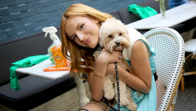 Actress Bella Thorne cuddles her pup Kingston during her appearance at the Green Works Muddy Puppy video premiere.