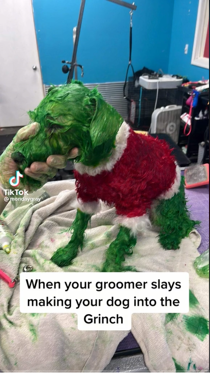 A dog owner is being criticized on social media for grooming her four-legged friend to look like the Grinch.