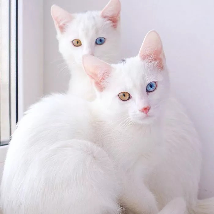 The number one difference between an albino cat and a white cat can be found in the eyes. Because of their total lack of pigmentation, true albino cats' eyes are limited to a very pale blue or may appear pinkish or pinkish-blue. White cats, on the other hand, tend to possess different eye colors, including heterochromia eyes. A cat is said to have heterochromia eyes when, for instance, one eye is blue and the other a different color. Take the below picture as an example of white cats with heterochromia eyes.