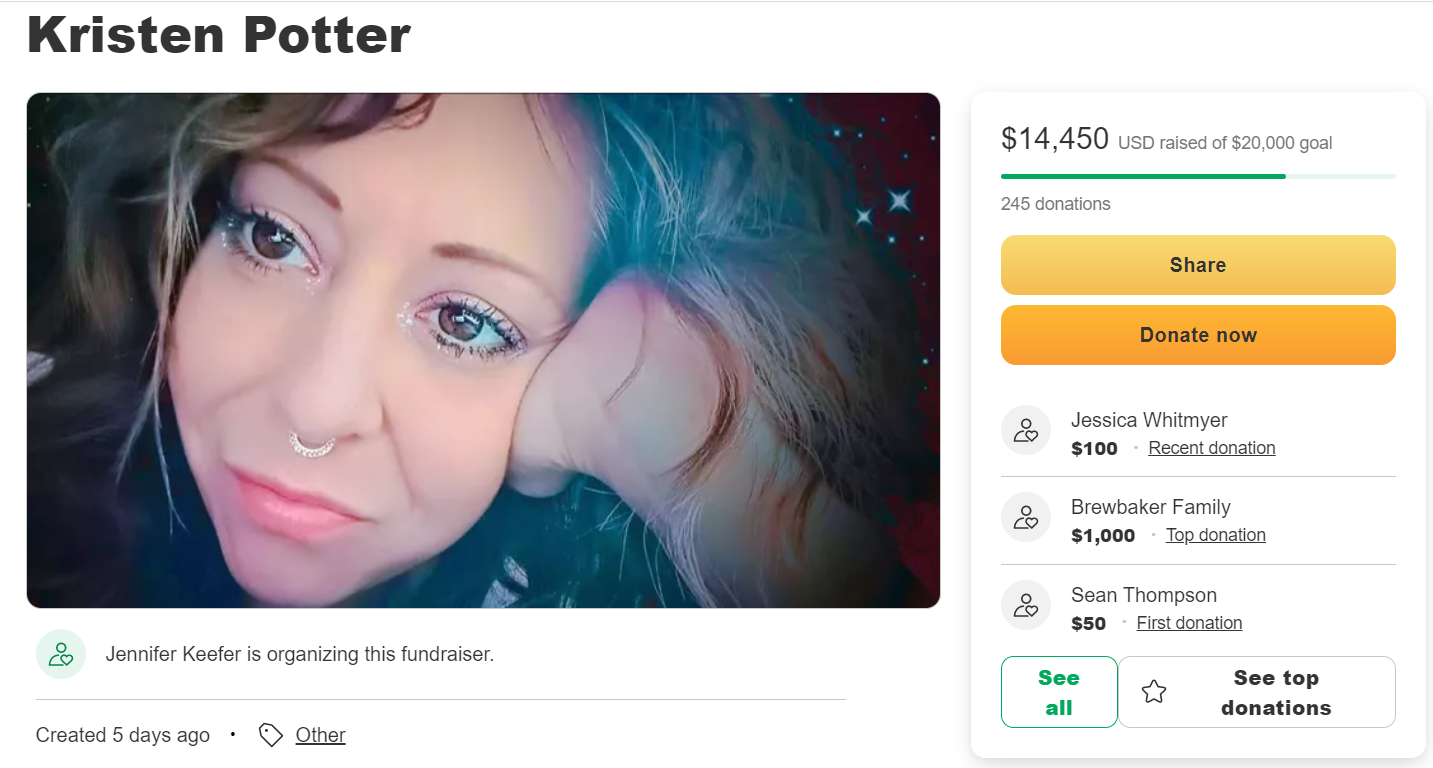 Kristen Potter left behind her husband and two sons. A GOFUNDME page was created to support her children and as of the time of this writing, $14,450 has been of the $20,000 goal.