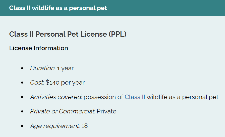 To apply for the Florida Class II Personal Pet License, you need to be at least 18 years old. The cost of the license is $140 per year. On the other hand, the age requirement for the Class III permit, which is free and lasts for two years, is 16. To apply, visit the Florida Wildlife as a Personal Pet page and scroll down to "Permit/License Options."