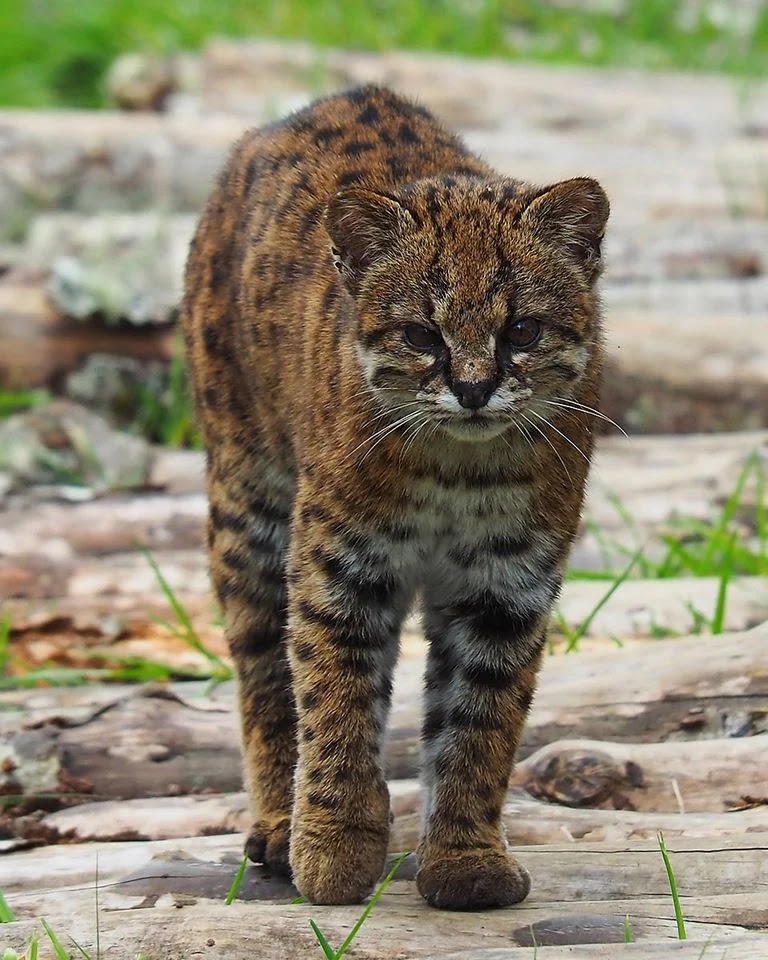 Like the Geoffroy's cat, the Leopard cat is a small wild cat that is about the size of a house cat. It is listed as "Least Concern" on the IUCN Red List and can be found in continental South, Southeast, and East Asia. Adult Leopard cats typically weigh between 2-8 pounds and measure up to 26 inches in head-body length. Leopard cats live up to 20 years. Leopard cats are crossed with domestic cats to produce the Bengal, a domesticated cat breed.