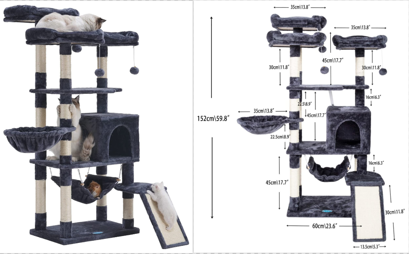 This super large cat tree is designed to satisfy your Savannah or Bengal cat's needs to scratch, play, climb, sleep, and exercise. If your cute cats love climbing up and down together, then this cat tree is for them to have endless climbing fun. The tree's unique rectangle super large condo and wide hammock are perfect for Savannah and Bengal cats to rest together.