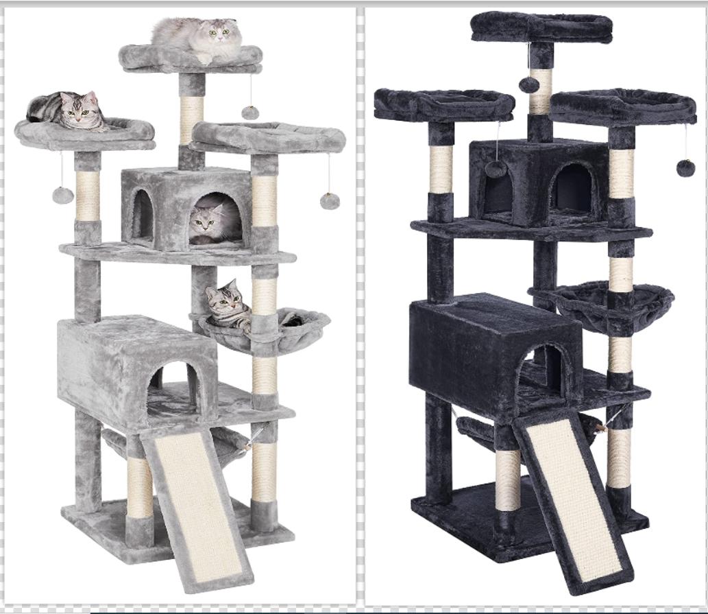 This beautiful cat tree for large cats comes in two colors: Light grey and Black. You can choose the one that matches your interior decoration. The tree features three top perches, two condos, a luxurious basket, and a hammock. To avoid wobbling or tipping over while your cats are chasing each other and jumping up and down, the tree is reinforced with natural baseboard and includes an extra anti-toppling strap so the cat tree can be anchored to the wall for extra safety. The tree comes with step by step instruction for quick and easy installation.