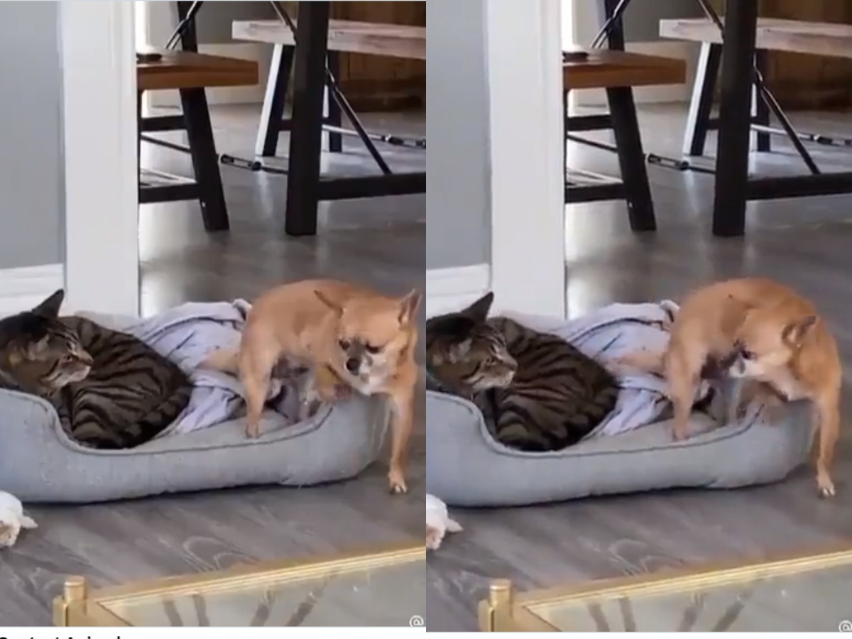In a hilarious Twitter video that has gone viral, a small dog is seen struggling to find a comfortable spot to sleep next to a large cat on the same bed. The video shows the cat already settled on the bed, leaving the dog to find a way to get on without touching the feline. The footage captures the dog's evident discomfort, as it struggles to settle down beside the "bully."