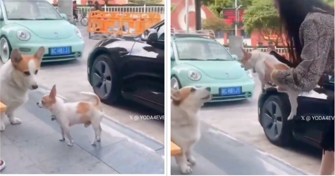 In a comical yet endearing display of canine behavior, a Pembroke Welsh Corgi and a Chihuahua engage in a hilarious barking match. However, there's an interesting twist - the Chihuahua only barks when it is being carried by its owner. The moment the little pup is placed on the ground to face the confident Corgi, it remains eerily silent.