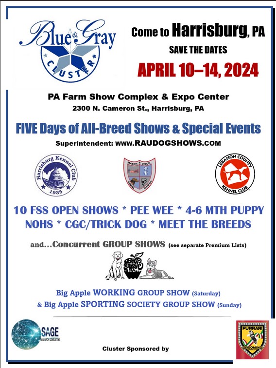 Mark your calendar for the Blue and Gray Cluster, an all-breed AKC dog show that will be held by Harrisburg Kennel Club from April 10 through 14, 2024, at the Pennsylvania Farm Show Complex & Expo Center, 2300 N. Cameron Street, Harrisburg, PA.