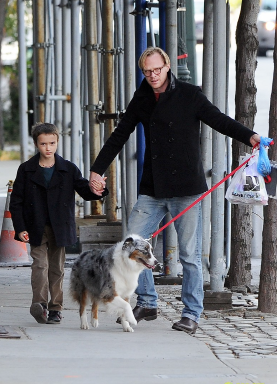 Actor Paul Bettany and his wife Jennifer Connelly own or owned a blue merle Australian Shepherd as a family dog. In the above photo, Bettany is seen with his son and their Australian Shepherd during an outing in Manhattan, New York.