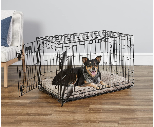 While the above crate has 2 doors and measures 36 inches in length, this one measures 42 inches in length and has a single door. Measuring 42"L x 28"W x 30"H, this crate is suitable for Australian Shepherds up to 90 pounds. Like the one above, this crate comes with a divider panel and a leak-proof plastic pan. It also features protective rubber feet and a carrying handle. The differences between this crate and the one above are the size and number of entrances.