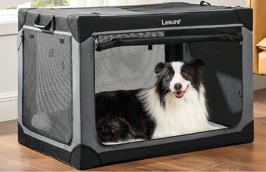 Measuring 36"L x 25"W x 25"H, this soft-sided dog crate can accommodate dogs up to 70 pounds.