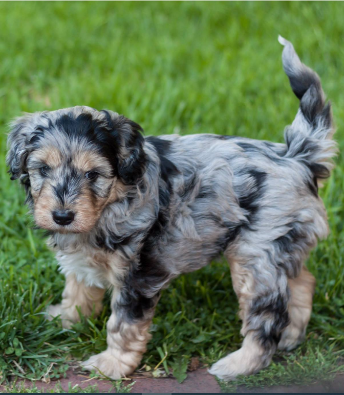 Aussiedoodles can have curly, wavy, or straight coats and can be black, brown, and red. They can also be red merle and blue merle. The red merle coat exhibits a striking pattern that combines various shades of red, cream, and white, while the blue merle Aussiedoodle's coat color features a captivating pattern of black, gray, and white patches. This pattern creates the appearance of a marbled or speckled coat.